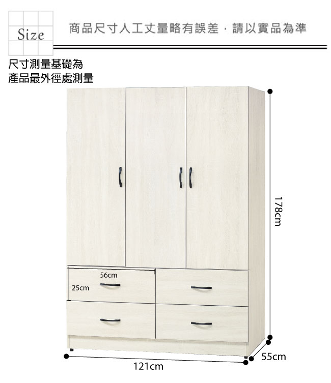 ◆產品名稱:【綠家居】泰格 時尚4尺木紋三門衣櫃(三色可選+四抽屜+吊衣桿)