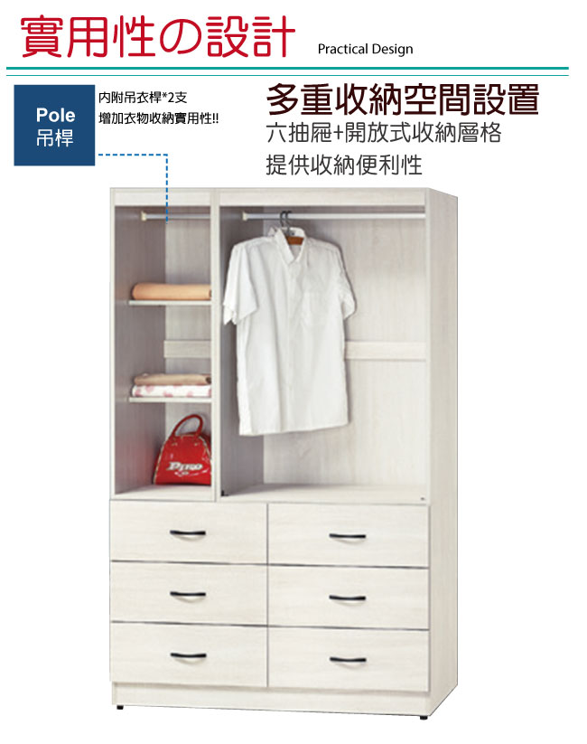 六抽屜+開放式層格+吊衣桿等收納設計,讓您保持空間整齊乾淨不再是夢想