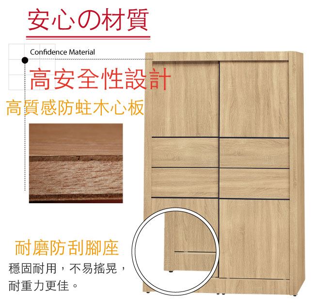 材質 | ◆產品名稱:【綠家居】廷布 現代5.1尺木紋推門衣櫃/收納櫃 尺寸:(寬)152x(深)60x(高)200/公分 ◆材質: 材質:防蛀木心板+五金滑軌結構+防刮耐磨腳座 塗漆:優利坦全包式耐磨噴漆處理 |
