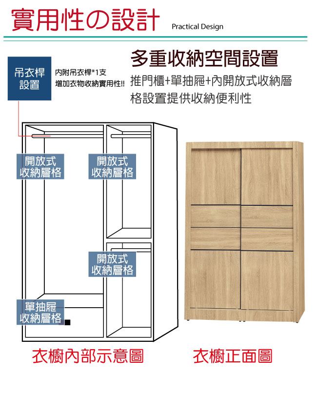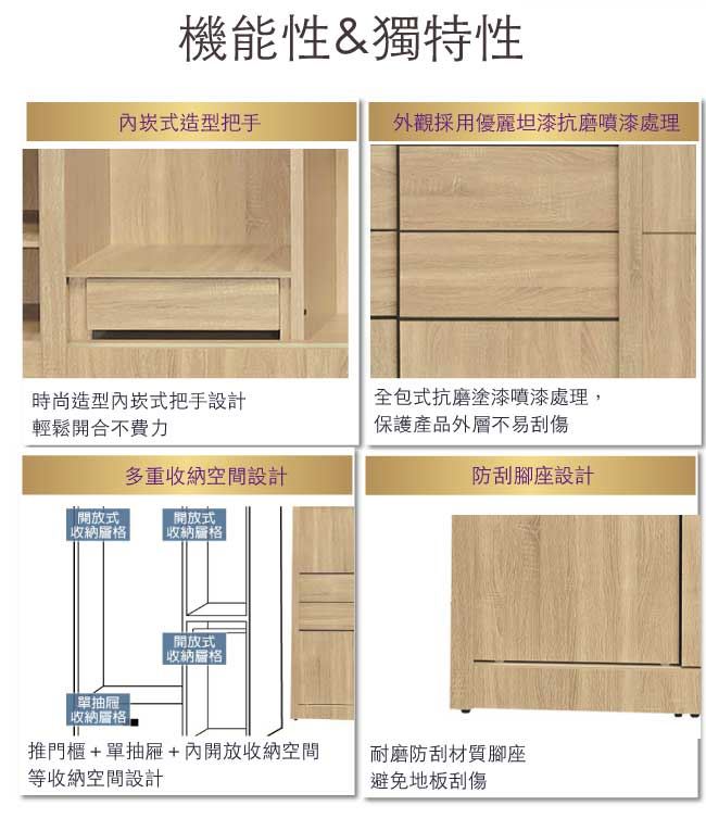 商品介紹 | 【綠家居】廷布 現代5.1尺木紋推門衣櫃/收納櫃 橡木紋色系+現代簡約風格+安心材質製造,整體採用防蛀木心板+五金滑軌結構+防刮耐磨腳座等安心材質製造,外層採用優利坦全包式耐磨噴漆處理搭配單抽屜+內開放式層格等收納設計,全由專人配送到家,專業安心服務,替你省下更多時間! 【商品特色】 橡木紋色系+現代簡約風格+安心材質製造,使用放心+搭配居家更便利 採用防蛀木心板+五金滑軌結構+防刮耐磨腳座等安心材質製造 採用單抽屜+內開放式層格等收納設計 此商品不需要DIY組立,此商品為組立後之成品 品質保證、專業設計、貼心服務 全由專人配送到家,專業安心服務,替您省下更多時間 |