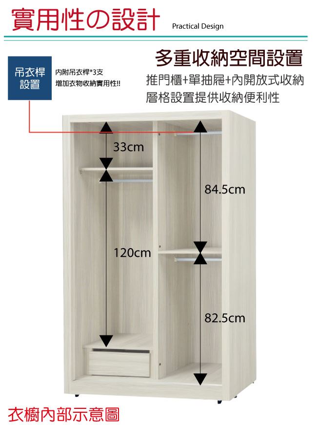 - 推門櫃+吊衣桿+單抽屜