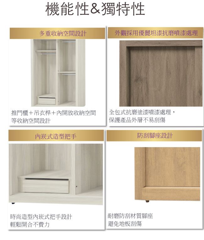 商品介紹 | 【綠家居】芬米 木紋5尺推門衣櫃/收納櫃/四色可選) 四色可選+現代簡約風格+安心材質製造,整體採用防蛀木心板+五金滑軌結構+防潮耐磨腳座等安心材質製造,外層採用優利坦全包式耐磨噴漆處理搭配推門櫃+吊衣桿+單抽屜+內開放式收納等收納設計,全由專人配送到家,專業安心服務,替你省下更多時間! 【商品特色】 四色可選+現代簡約風格+安心材質製造,使用放心+搭配居家更便利 採用防蛀木心板+五金滑軌結構+防潮耐磨腳座等安心材質製造 推門櫃+吊衣桿+單抽屜+內開放式收納等收納設計 此商品不需要DIY組立,此商品為組立後之成品 品質保證、專業設計、貼心服務 全由專人配送到家,專業安心服務,替您省下更多時間 |