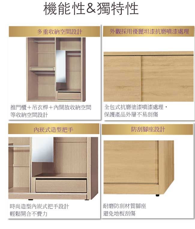 材質 | ◆產品名稱: 【綠家居】奧米 木紋5尺推門衣櫃/收納櫃(吊衣桿+二抽屜+側拉穿衣鏡面) 尺寸:(寬)149x(深)60x(高)198/公分 ◆材質: 材質:防蛀木心板+防潮耐磨腳座+五金滑軌結構+強化玻璃鏡面 噴漆:防潮耐磨噴漆處理