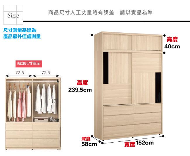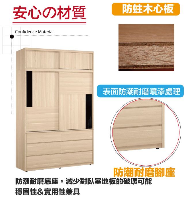 材質 | ◆產品名稱:【綠家居】波卡帝5.1尺六抽推門加高衣櫃/收納櫃組合 尺寸:(寬)152(深)58(高)239.5公分 ◆材質: 材質:防蛀木心板+防潮耐磨腳座+五金滑軌結構 噴漆:防潮耐磨噴漆處理