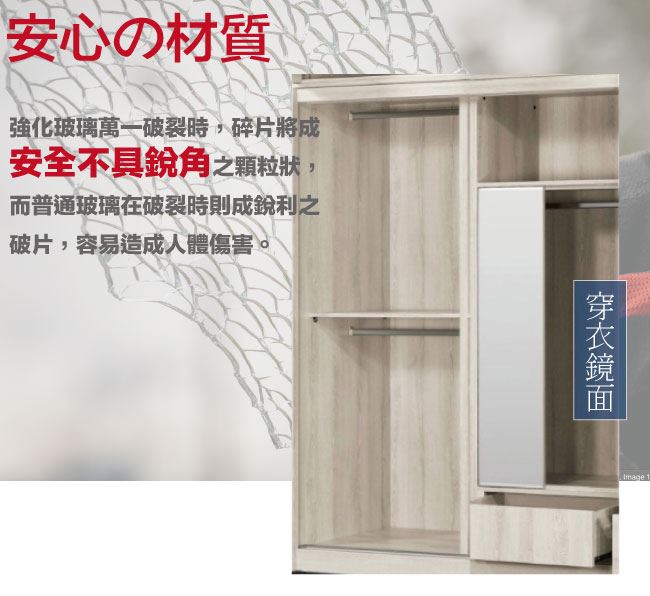 材質 | ◆產品名稱:【綠家居】哈爾莉5尺推門衣櫃(內含穿衣鏡面) 尺寸:(寬)151x(深)60(高)200公分 ◆材質: 材質:防蛀木心板+防潮耐磨腳座+五金滑軌結構+強化玻璃鏡面 噴漆:防潮耐磨噴漆處理