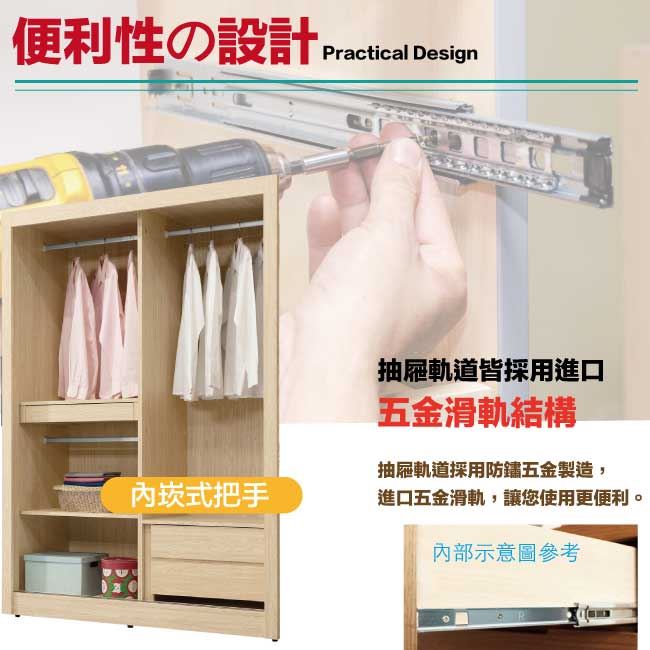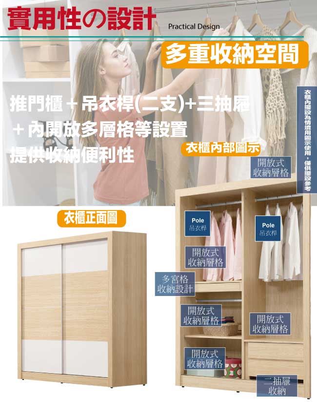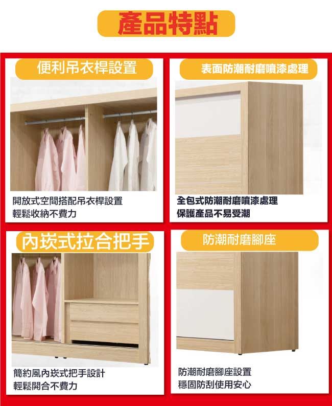 商 品 介 紹 | 【綠家居】布肯5尺推門衣櫃 木紋雙色系+現代簡約風格+安心材質製造,整體採用防蛀木心板+防潮耐磨腳座+五金滑軌結構等安心材質製造,產品外層採用防潮耐磨噴漆處理搭配採用推門櫃+三抽屜+內開放式層格等收納空間設計,全由專人配送到家,專業安心服務,替你省下更多時間! 【商品特色】 木紋雙色系+現代簡約風格+安心材質製造,使用放心+搭配居家更便利 採用防蛀木心板+防潮耐磨腳座+五金滑軌結構等安心材質製造 產品外層採用防潮耐磨噴漆處理 採用推門櫃+三抽屜(含多宮格抽屜)+內開放式層格等收納空間設計 此商品不需要DIY組立,此商品為組立後之成品 品質保證、專業設計、貼心服務 全由專人配送到家,專業安心服務,替您省下更多時間 |