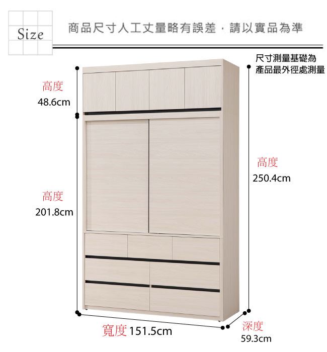 材質 | ◆產品名稱:【綠家居】亞卡5.1尺開&推門七抽加高衣櫃組合 尺寸:(寬)151.5x(深)59.3(高)250.4公分 ◆材質: 材質:防蛀木心板+防潮耐磨腳座+防夾手緩衝門片五金+五金滑軌結構 噴漆:防潮耐磨噴漆處理