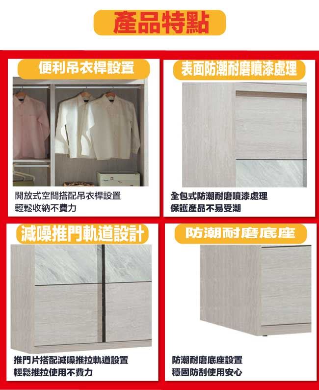 材質 | ◆產品名稱:【綠家居】蘿珊雙色5尺推門內二抽衣櫃 尺寸:(寬)151x(深)59x(高)194/公分 ◆材質: 材質:防蛀木心板+防潮耐磨底座+五金滑軌結構 噴漆:防潮耐磨噴漆處理 |