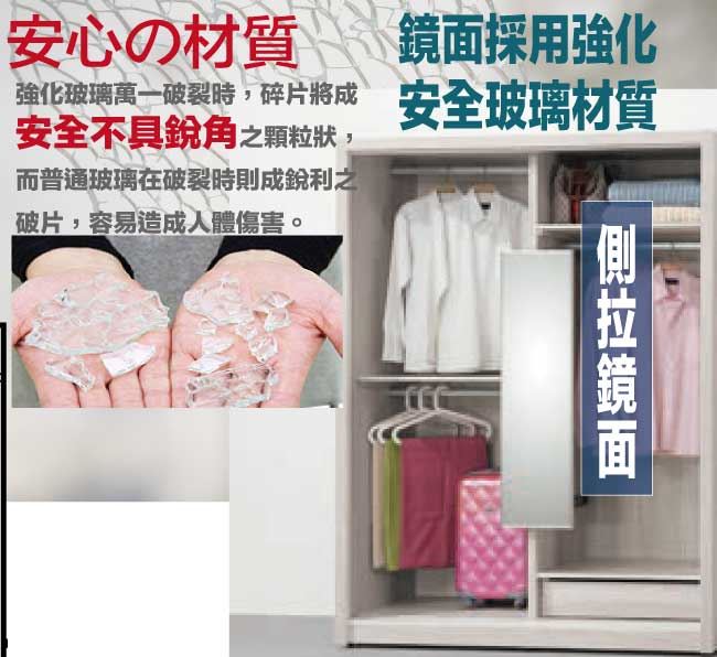 材質 | ◆產品名稱:【綠家居】麥法亞雙色5.2尺推門衣櫃(附設側拉穿衣鏡面) 尺寸:(寬)156x(深)60x(高)197/公分 ◆材質: 材質:防蛀木心板+防潮耐磨腳座+五金滑軌結構+強化玻璃鏡面 噴漆:防潮耐磨噴漆處理 |