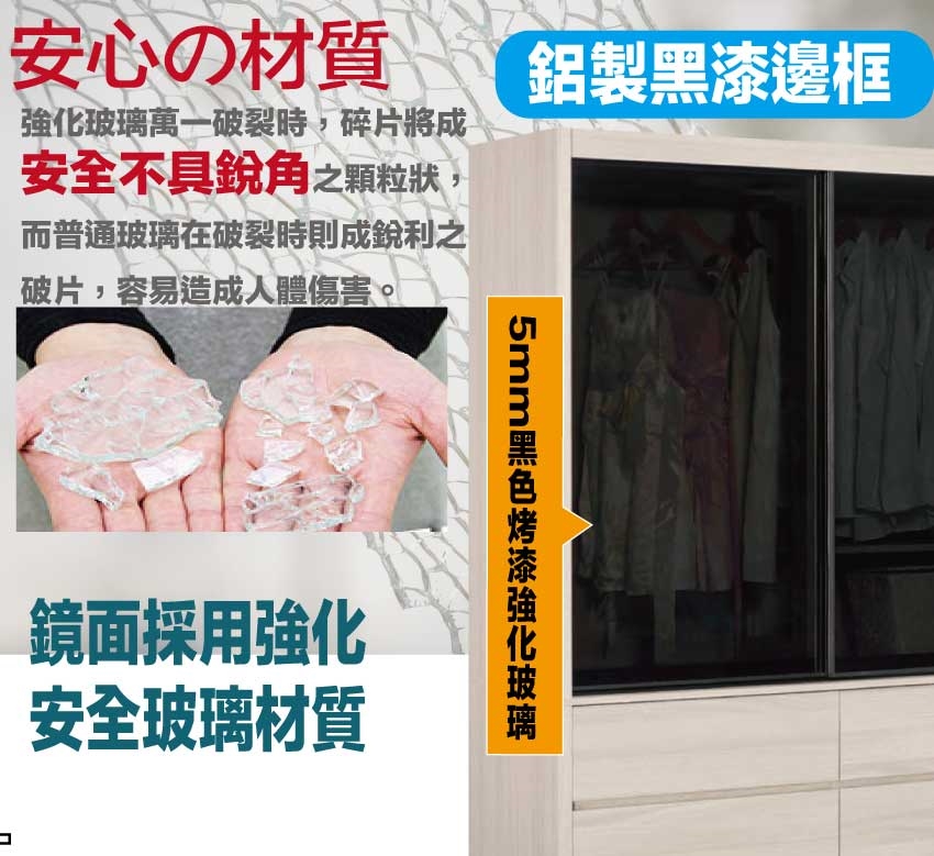 採用防蛀木心板+防潮耐磨底座+五金滑軌結構+鋁製黑漆邊框+5mm強化黑玻璃等安心材質製造