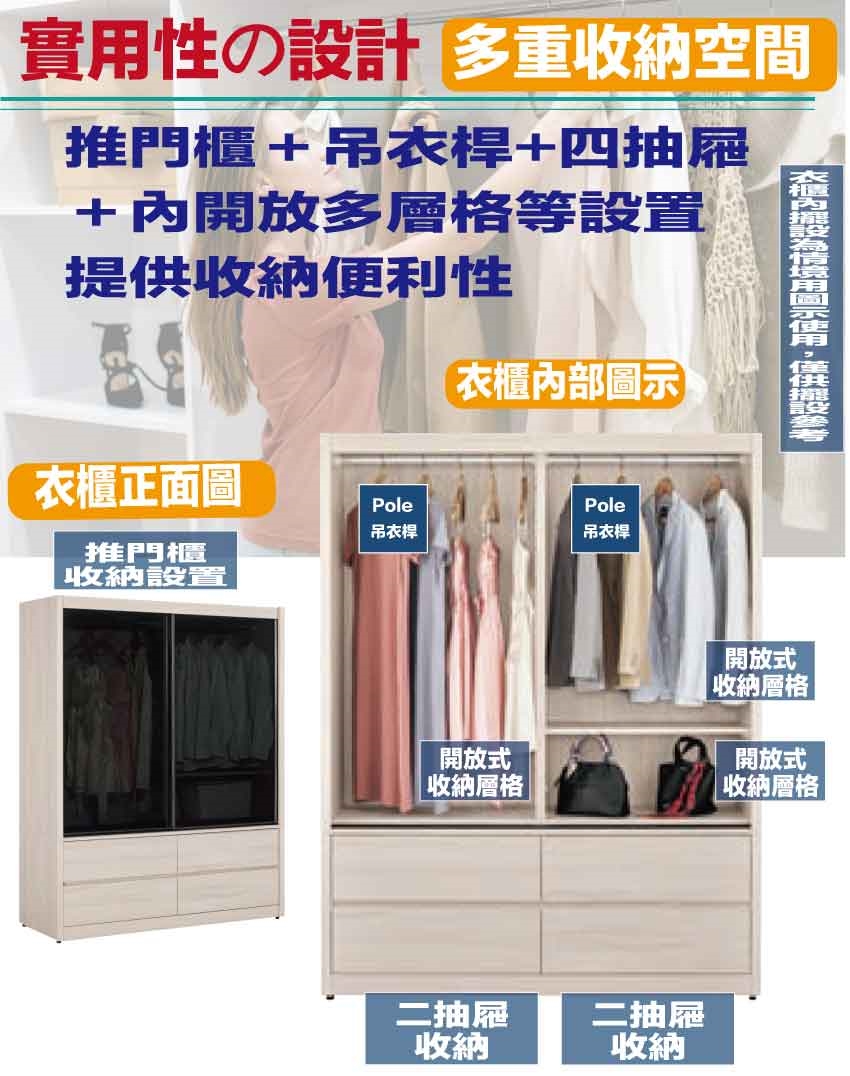 搭配採用推門櫃+吊衣桿+四抽屜+內開放層格等收納空間設計