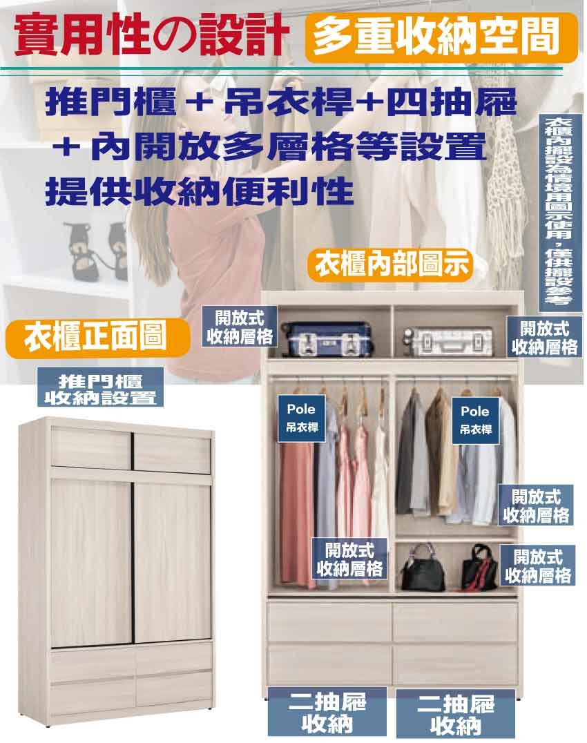 搭配採用推門櫃+吊衣桿+四抽屜+內開放層格等收納空間設計