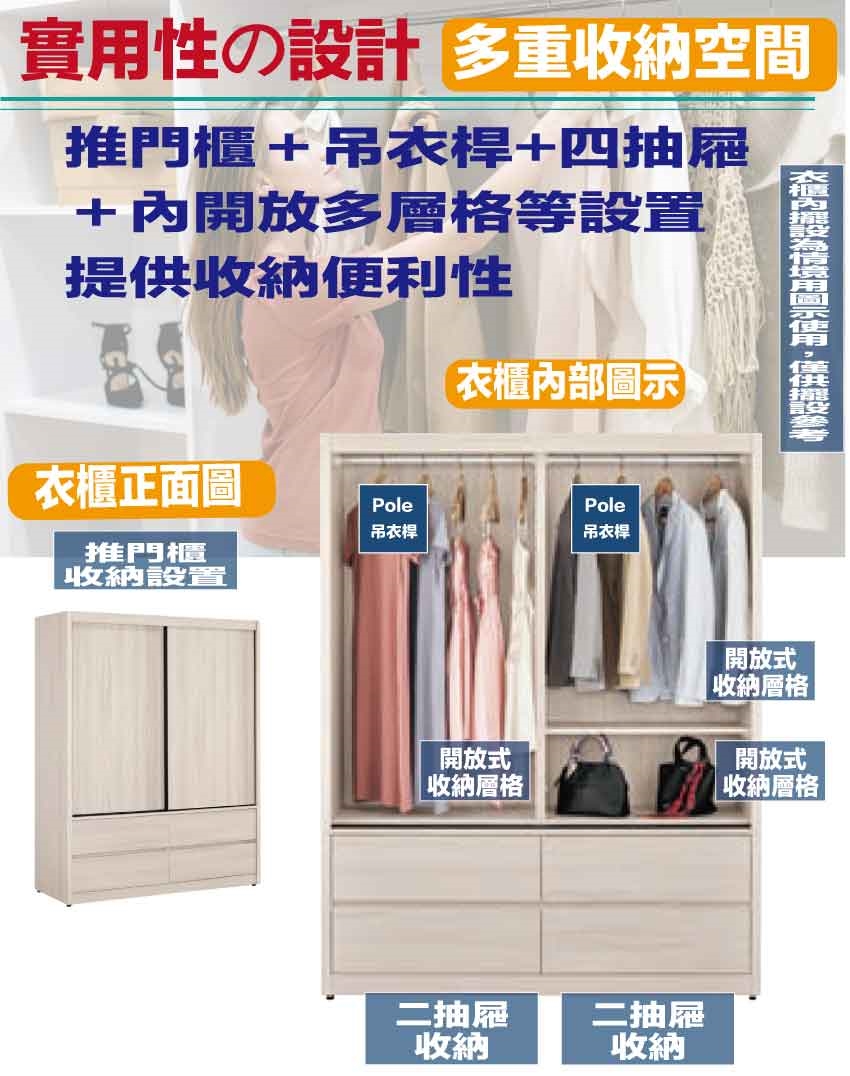 搭配採用推門櫃+吊衣桿+四抽屜+內開放層格等收納空間設計