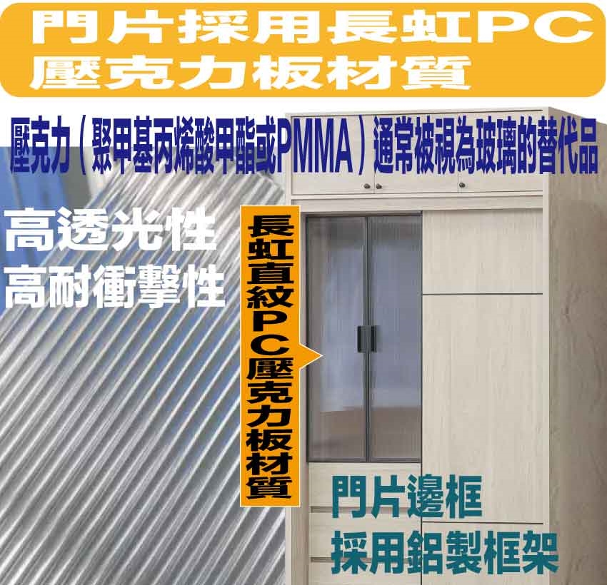材質:防蛀木心板+防潮耐磨腳座+五金滑軌結構+長虹直紋PC壓克力板+防夾手緩衝五金