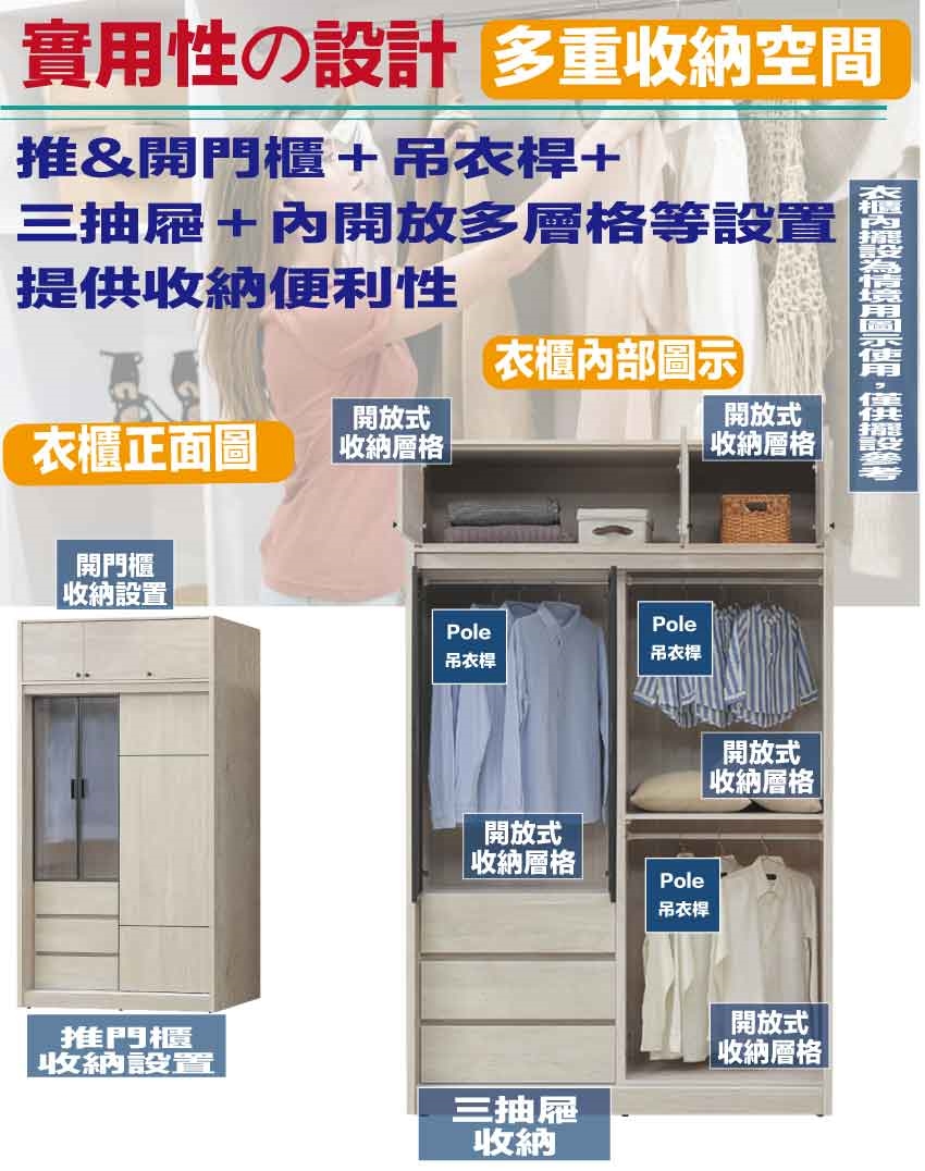 搭配採用開門櫃&推門櫃+吊衣桿+三抽屜+內開放多層格等收納空間設計