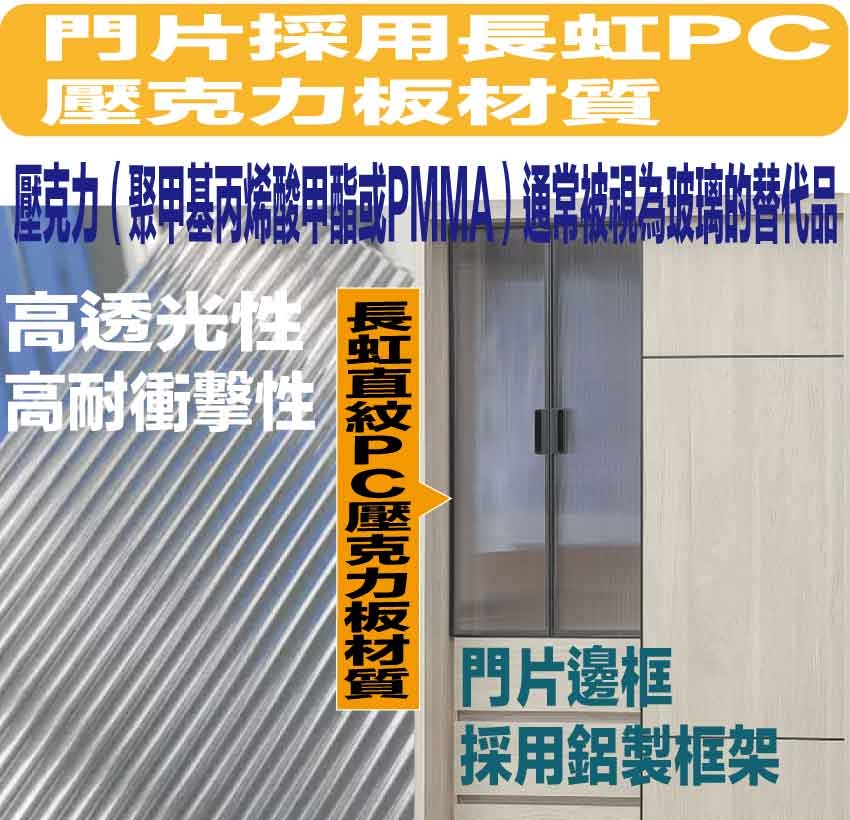 材質:防蛀木心板+防潮耐磨腳座+五金滑軌結構+長虹直紋PC壓克力板+防夾手緩衝五金