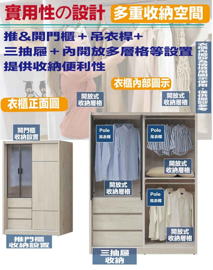 搭配採用開門櫃&推門櫃+吊衣桿+三抽屜+內開放多層格等收納空間設計
