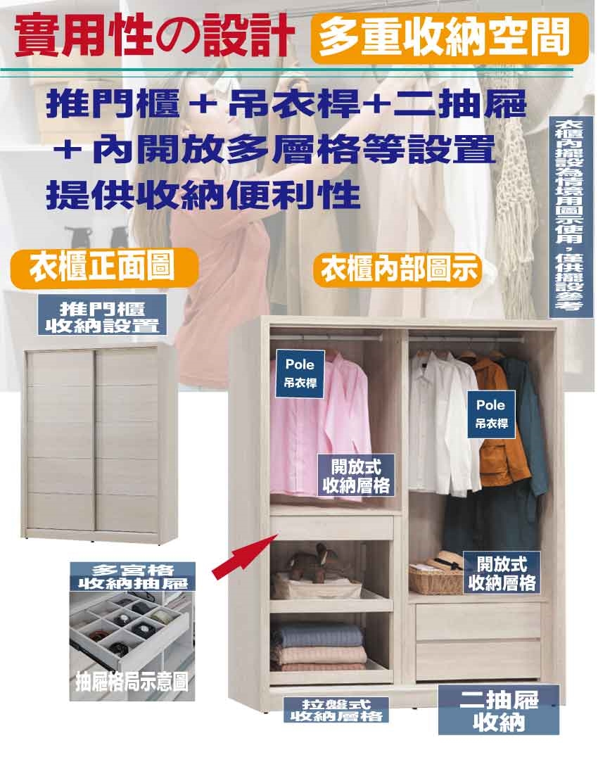 搭配採用推門櫃+吊衣桿+二抽屜+多宮格收納抽+內開放層格等收納空間設計