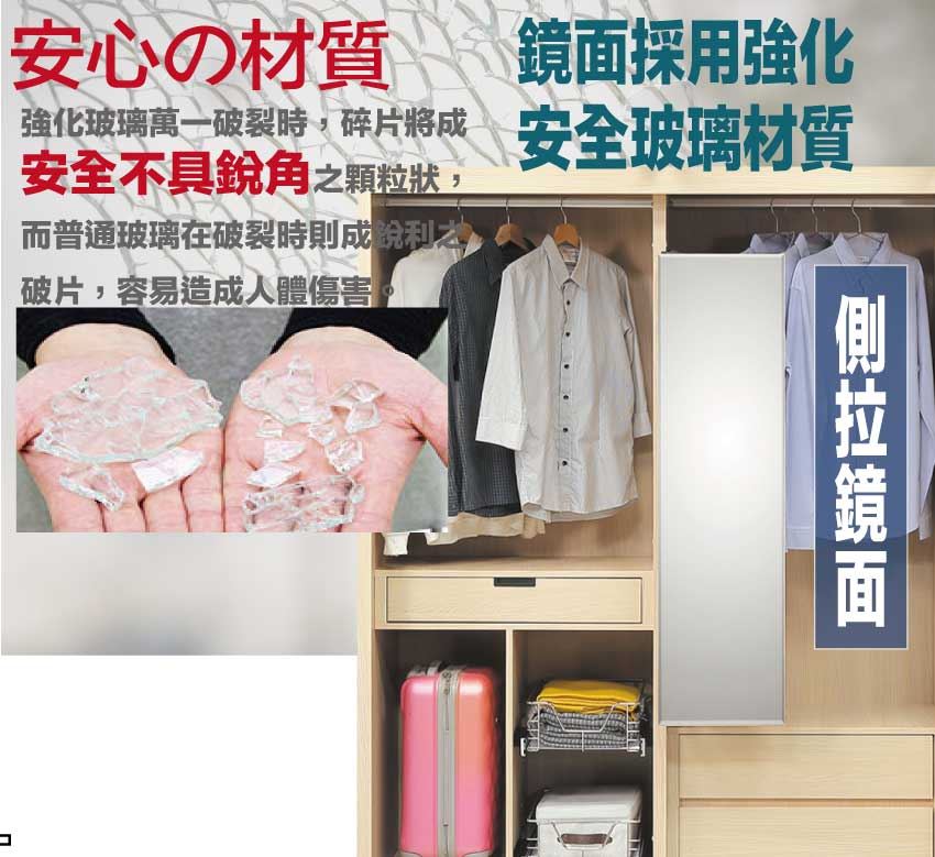 採用防蛀木心板+五金滑軌結構+強化玻璃鏡面+防潮耐磨底座等安心材質製造