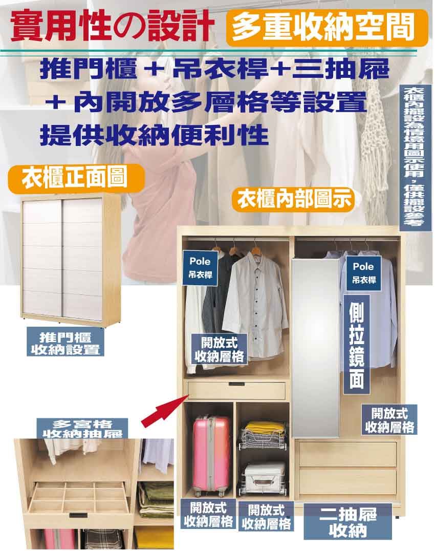 搭配採用推門櫃+吊衣桿+三抽屜(含多宮格抽屜)+內&外開放層格+側拉玻璃鏡面設置等收納空間設計