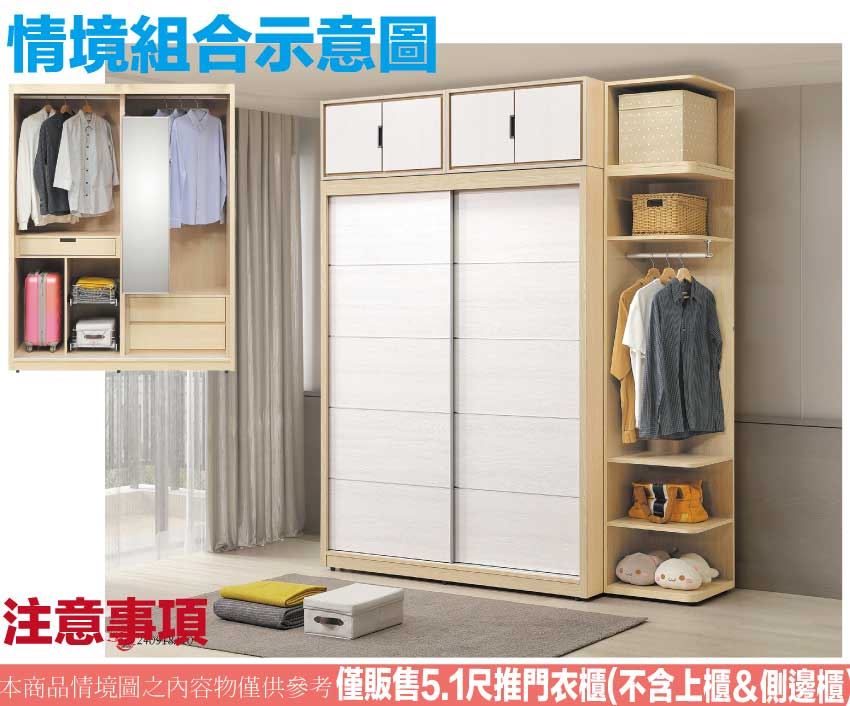 ★偏遠地區需額外加收運費,下標請先問與答詢問★ ★下訂前注意 由於商品流動較快,下訂前請先詢問是否有貨在下訂喔~★ 【綠家居】亞卡利5.1尺推門雙色衣櫃 木紋雙色系+安心材質製造,使用放心+搭配居家更便利,採用防蛀木心板+五金滑軌結構+強化玻璃鏡面+防潮耐磨底座等安心材質製造 ,外層採用防潮耐磨噴漆處理搭配採用推門櫃+吊衣桿+三抽屜(含多宮格抽屜)+內&外開放層格+側拉玻璃鏡面設置等收納空間設計,全由專人配送到家,專業安心服務,替你省下更多時間!