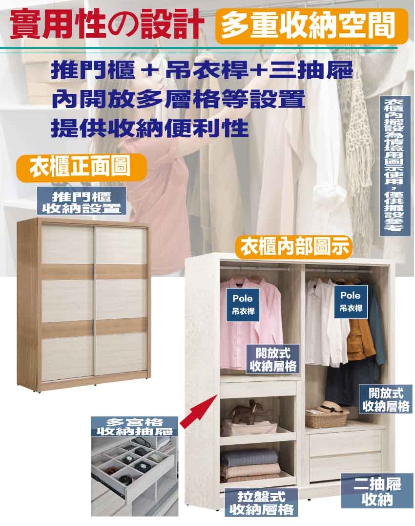 搭配採用推門櫃+吊衣桿+三抽屜(含多宮格收納抽)+內開放多層格等收納空間設計
