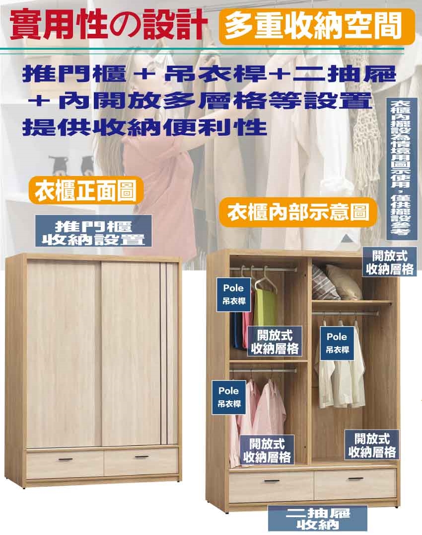 搭配採用推門櫃+吊衣桿+二抽屜+內開放層格等收納空間設計