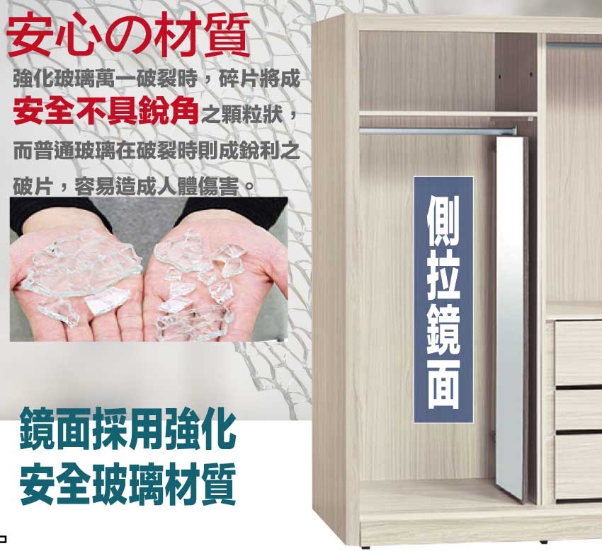 採用防蛀木心板+防潮耐磨底座+五金滑軌結構+強化玻璃鏡面內+含側拉穿衣鏡面等安心材質製造