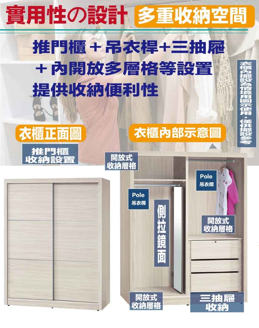 搭配採用推門櫃+吊衣桿+三抽屜+內開放層格等收納空間設計