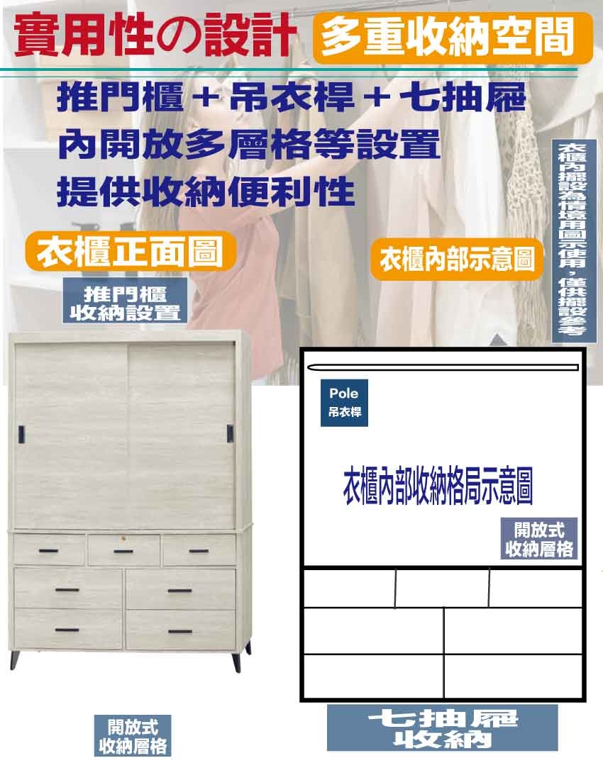 搭配採用推門櫃+吊衣桿+七抽屜+內開放層格等收納空間設計