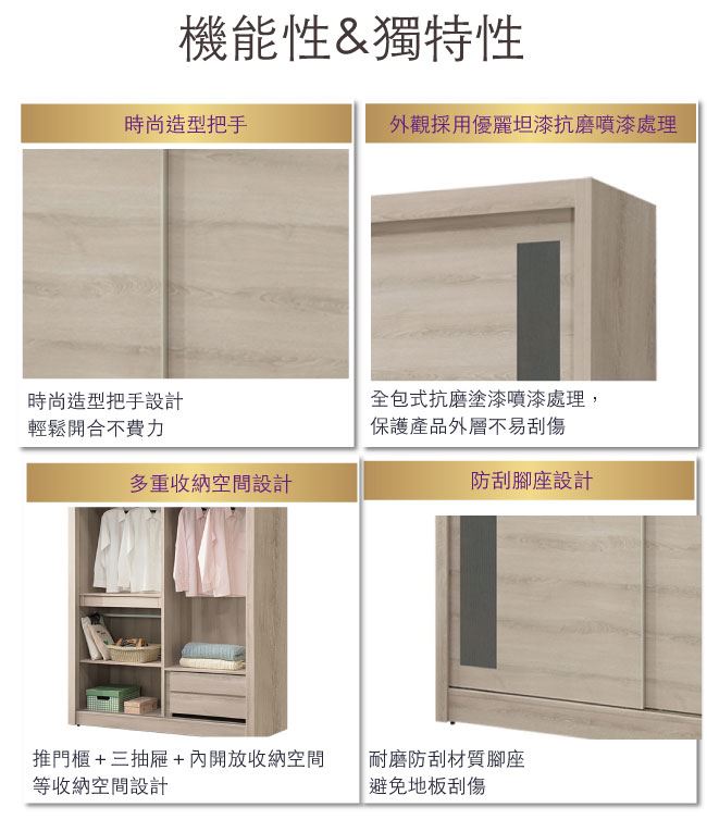 商品介紹 | 【綠家居】額爾 現代5尺推門衣櫃/收納櫃 白橡木紋色+現代簡約風格+安心材質製造,整體採用防蛀木心板+防刮耐磨腳座+五金滑軌結構等安心材質製造,外層採用優利坦全包式耐磨噴漆處理搭配開門櫃+吊衣桿+三抽屜(含多宮格收納抽屜)+內開放式收納等收納設計,全由專人配送到家,專業安心服務,替你省下更多時間! 【商品特色】 白橡木紋色+現代簡約風格+安心材質製造,使用放心+搭配居家更便利 採用防蛀木心板+防刮耐磨腳座+五金滑軌結構等安心材質製造 開門櫃+吊衣桿+三抽屜(含多宮格收納抽屜)+內開放式收納等收納設計 此商品不需要DIY組立,此商品為組立後之成品 品質保證、專業設計、貼心服務 全由專人配送到家,專業安心服務,替您省下更多時間 |