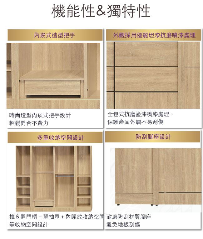 商品介紹 | 【綠家居】廷布 現代6.8尺推&開門衣櫃/收納櫃 橡木紋色系+現代簡約風格+安心材質製造,整體採用防蛀木心板+五金滑軌結構+防刮耐磨腳座等安心材質製造,外層採用優利坦全包式耐磨噴漆處理搭配單抽屜+內開放式層格等收納設計,全由專人配送到家,專業安心服務,替你省下更多時間! 【商品特色】 橡木紋色系+現代簡約風格+安心材質製造,使用放心+搭配居家更便利 採用防蛀木心板+五金滑軌結構+防刮耐磨腳座等安心材質製造 採用單抽屜+內開放式層格等收納設計 此商品不需要DIY組立,此商品為組立後之成品 品質保證、專業設計、貼心服務 全由專人配送到家,專業安心服務,替您省下更多時間 |