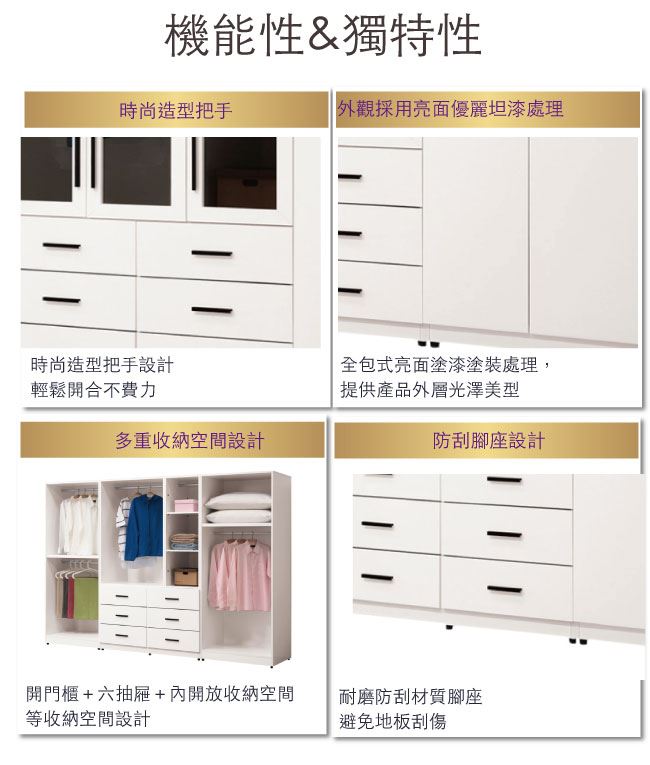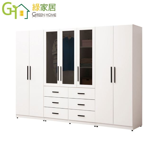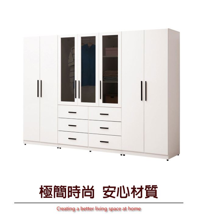 商品介紹 | 【綠家居】海地 現代9尺多功能衣櫃/收納櫃組合 現代白色系+現代美型外觀+安心材質設計,就是這種頂級質感的設計,能輕鬆地融入各種空間風格,採用防蛀木心板+五金滑軌結構+防夾手緩衝門片五金等安心材質製造+優利坦亮面三層全包式噴漆處理,採用開門櫃+吊衣桿+六抽屜+內開放式多層格收納設計,現在購買專人送到府服務,免組裝+免運費,讓你省時省力省運費! 【商品特色】 現代白色系+現代美型外觀+安心材質設計 採用防蛀木心板+五金滑軌結構+防夾手緩衝門片五金等安心材質製造 外層採用優利坦亮面三層全包式塗漆塗裝處理 採用開門櫃+吊衣桿+六抽屜+內開放式多層格收納設計 專人送貨到府免組裝免運費服務,讓您省時又便利 |