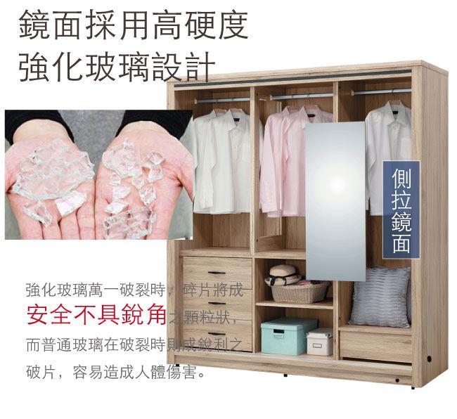 商品介紹 | 【綠家居】普蓋爾 時尚7尺推門衣櫃/收納櫃(附穿衣鏡面) 橡木紋色系+現代簡約風格+安心材質製造,整體採用防蛀木心板+五金滑軌結構+防潮耐磨腳座+強化玻璃鏡面等安心材質製造,搭配採用推門櫃+附穿衣鏡面+吊衣桿+四抽屜+內開放式收納層格等收納空間設計,全由專人配送到家,專業安心服務,替你省下更多時間! 【商品特色】 橡木紋色系+現代簡約風格+安心材質製造,使用放心+搭配居家更便利 採用防蛀木心板+五金滑軌結構+防潮耐磨腳座+強化玻璃鏡面等安心材質製造 採用推門櫃+附穿衣鏡面+吊衣桿+四抽屜+內開放式收納層格等收納空間設計 此商品不需要DIY組立,此商品為組立後之成品 品質保證、專業設計、貼心服務 全由專人配送到家,專業安心服務,替您省下更多時間 |