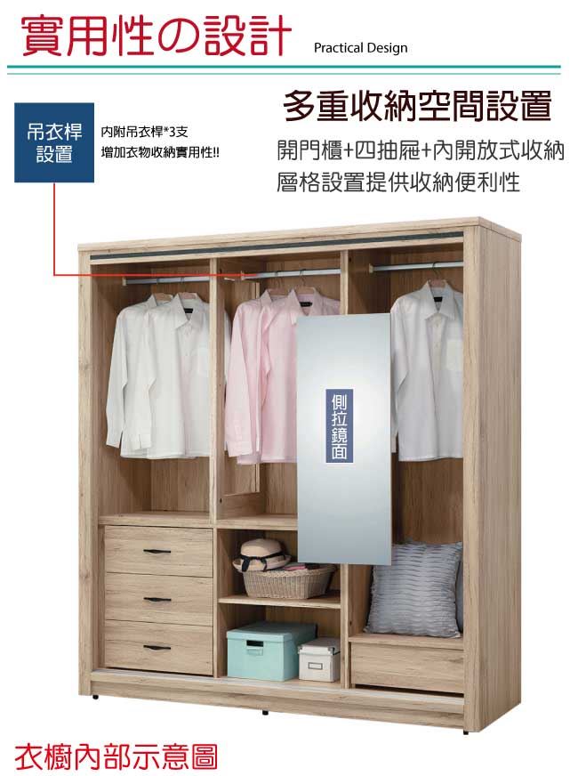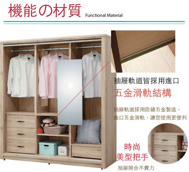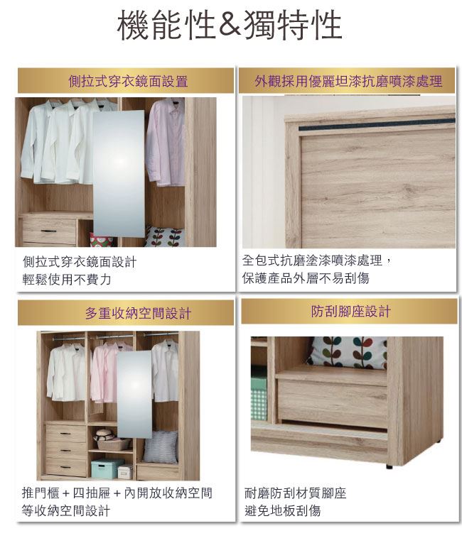 - 附穿衣鏡面+吊衣桿+四抽屜