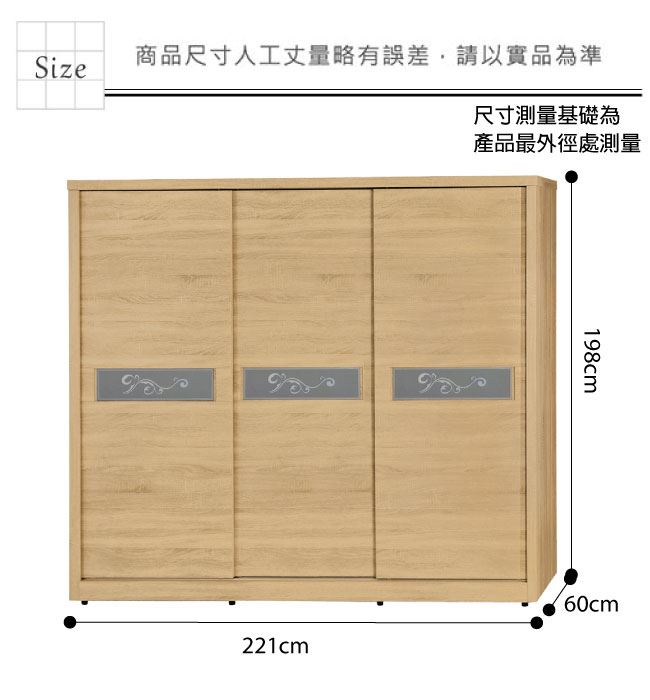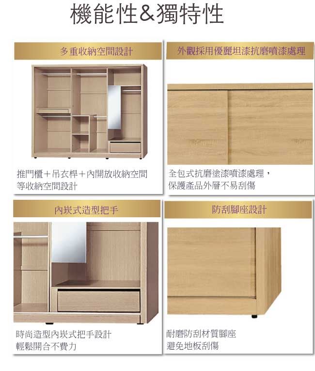 材質 | ◆產品名稱: 【綠家居】奧米 木紋7.4尺推門衣櫃/收納櫃(吊衣桿+二抽屜+側拉穿衣鏡面) 尺寸:(寬)221x(深)60x(高)198/公分 ◆材質: 材質:防蛀木心板+防潮耐磨腳座+五金滑軌結構+強化玻璃鏡面 噴漆:防潮耐磨噴漆處理