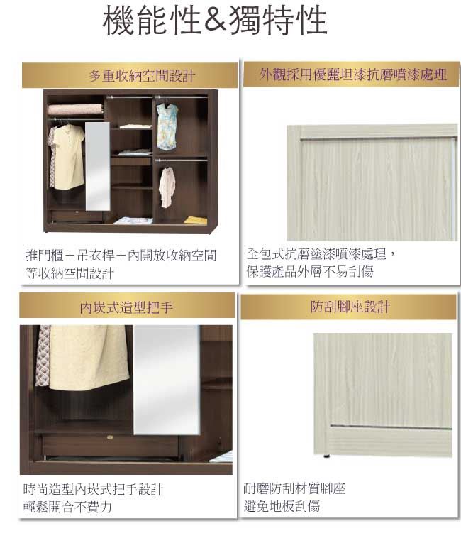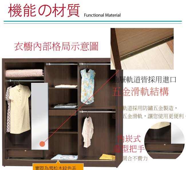 材質 | ◆產品名稱: 【綠家居】艾芬蘭 雪松7.1尺推門衣櫃/收納櫃(吊衣桿+二抽屜+側拉穿衣鏡面) 尺寸:(寬)212x(深)60x(高)200/公分 ◆材質: 材質:防蛀木心板+防潮耐磨腳座+五金滑軌結構+強化玻璃鏡面 噴漆:防潮耐磨噴漆處理