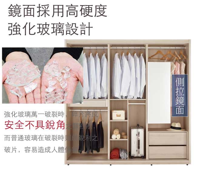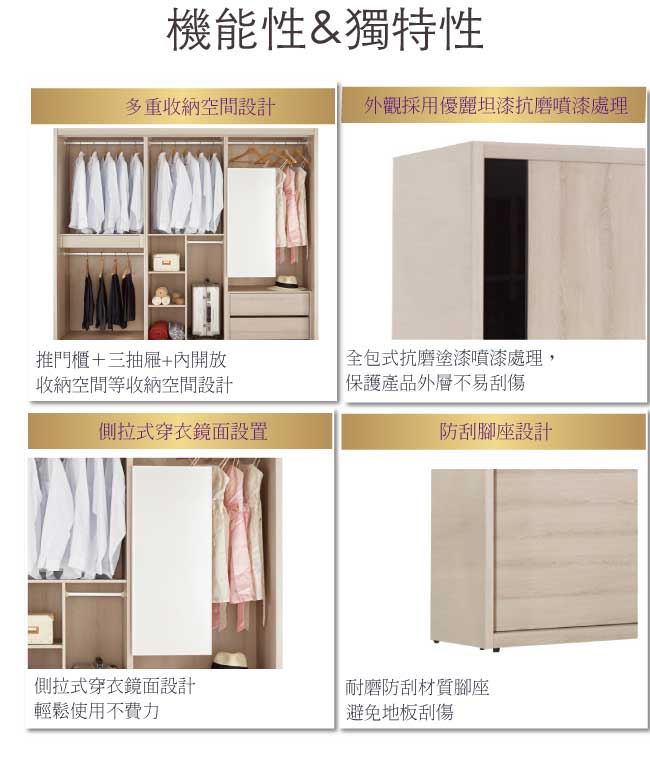 商品介紹 | 【綠家居】柏文 淺橡7尺推門衣櫃 淺橡木紋色系+現代簡約風格+安心材質製造,整體採用防蛀木心板+防潮耐磨腳座+五金滑軌結構+強化玻璃鏡面+5mm烤漆玻璃門片等安心材質製造,外層採用優利坦全包式耐磨噴漆處理搭配推門櫃+吊衣桿+三抽屜(含多宮格抽屜)+穿衣鏡面+內開放式收納等收納空間設計,全由專人配送到家,專業安心服務,替你省下更多時間! 【商品特色】 淺橡木紋色系+現代簡約風格+安心材質製造,使用放心+搭配居家更便利 採用防蛀木心板+防潮耐磨腳座+五金滑軌結構+強化玻璃鏡+5mm烤漆玻璃門片面安心材質製造 推門櫃+吊衣桿+三抽屜(含多宮格抽屜)+穿衣鏡面+內開放式收納等收納空間設計 此商品不需要DIY組立,此商品為組立後之成品 品質保證、專業設計、貼心服務 全由專人配送到家,專業安心服務,替您省下更多時間 |