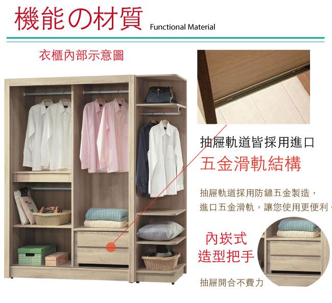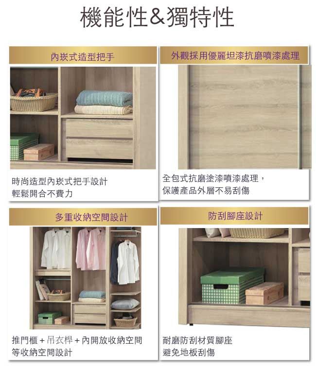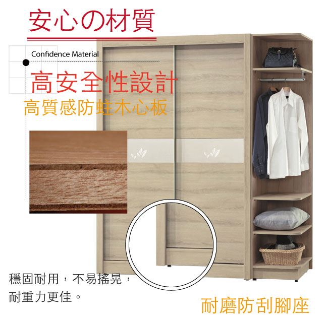 商品 介紹 | 【綠家居】布拉柴 時尚6.5尺推門衣櫃/收納櫃組合 白橡木紋色+現代簡約風格+安心材質製造,整體採用防蛀木心板+五金滑軌結構+防潮耐磨腳座等安心材質製造,搭配採用推門櫃+吊衣桿+三抽屜(含多宮格收納抽屜)+內開放式收納層格等收納空間設計,全由專人配送到家,專業安心服務,替你省下更多時間! 【商品特色】 白橡木紋色+現代簡約風格+安心材質製造,使用放心+搭配居家更便利 採用防蛀木心板+五金滑軌結構+防潮耐磨腳座等安心材質製造 採用推門櫃+吊衣桿+三抽屜(含多宮格收納抽屜)+內開放式收納層格等收納空間設計 此商品不需要DIY組立,此商品為組立後之成品 品質保證、專業設計、貼心服務 全由專人配送到家,專業安心服務,替您省下更多時間 |