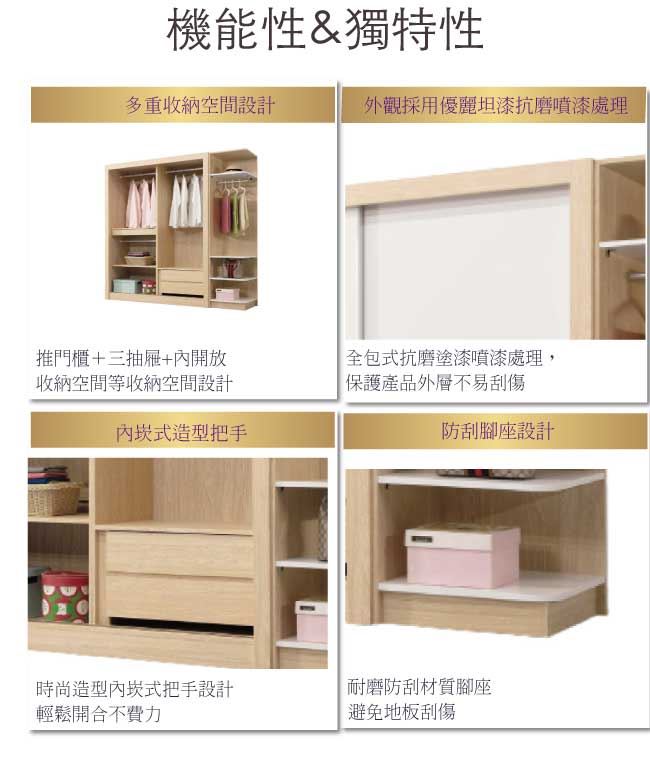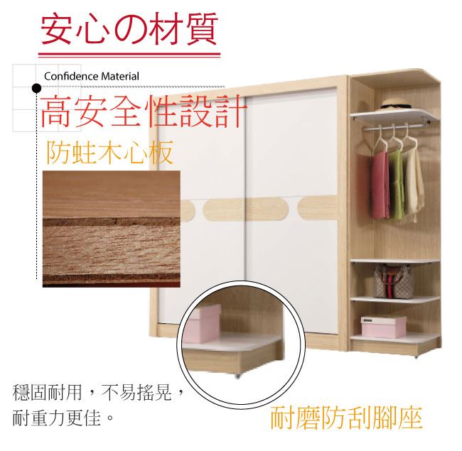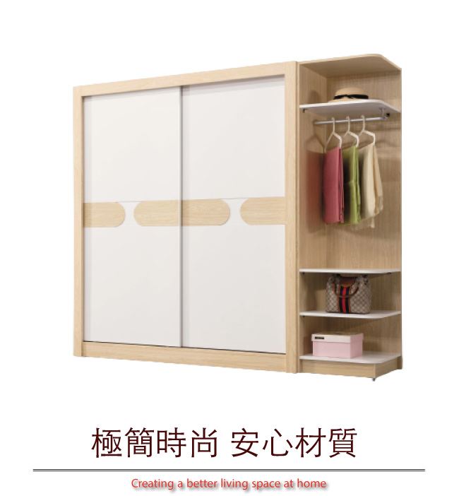 商 品 介 紹 | 【綠家居】比菲亞 雙色6.5尺推門衣櫃組合 木紋雙色系+現代簡約風格+安心材質製造,整體採用防蛀木心板+防潮耐磨腳座+五金滑軌結構等安心材質製造,外層採用優利坦全包式耐磨&亮面噴漆處理搭配推門櫃+吊衣桿+二抽屜+內&外開放式收納等收納空間設計,全由專人配送到家,專業安心服務,替你省下更多時間! 【商品特色】 木紋雙色系+現代簡約風格+安心材質製造,使用放心+搭配居家更便利 採用防蛀木心板+防潮耐磨腳座+五金滑軌結構安心材質製造 推門櫃+吊衣桿+二抽屜+內&外開放式收納等收納空間設計 此商品不需要DIY組立,此商品為組立後之成品 品質保證、專業設計、貼心服務 全由專人配送到家,專業安心服務,替您省下更多時間 |