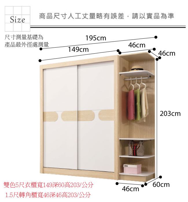 產品名稱:【綠家居】比菲亞 雙色6.5尺推門衣櫃組合 產品尺寸: 尺寸:(寬)195x(深)60x(高)203/公分 ◆材質: 材質:防蛀木心板+防潮耐磨腳座 材質:五金滑軌結構 塗漆:優利坦全包式耐磨&亮面噴漆處理