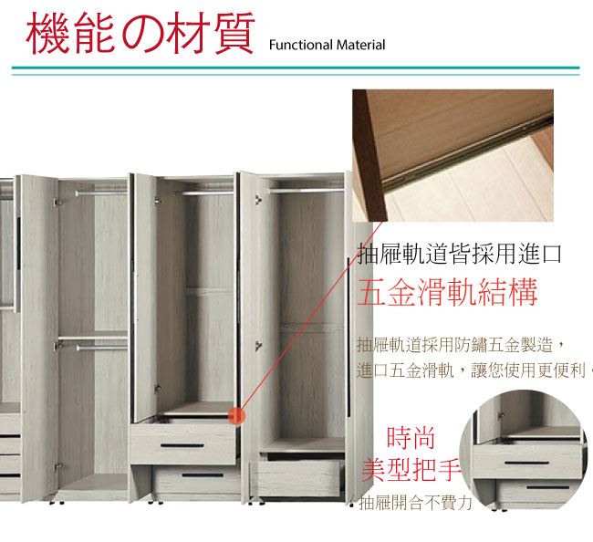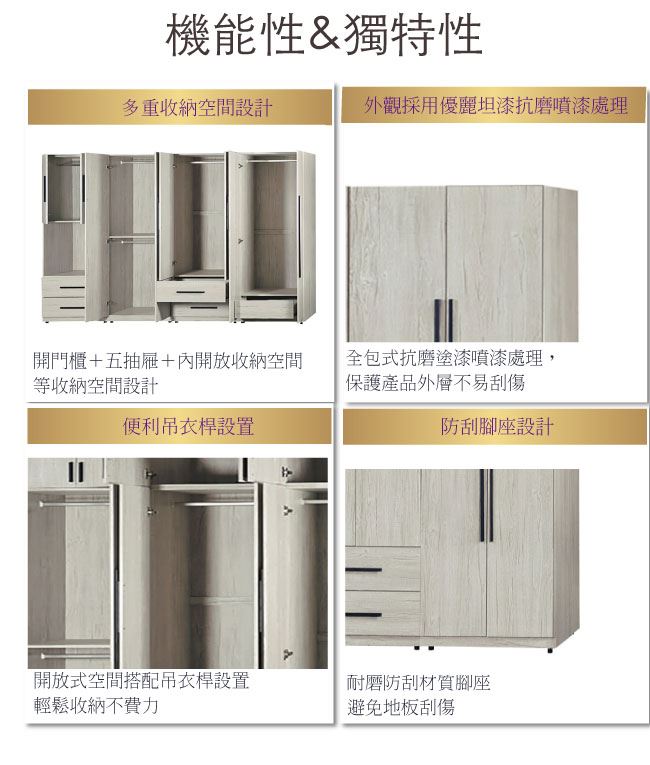 商 品 介 紹 | 【綠家居】夏艾亞淺橡10.1尺八門四抽衣櫃組合 淺橡木紋色系+現代簡約風格+安心材質製造,整體採用防蛀木心板+防刮耐磨腳座+五金滑軌結構等安心材質製造,產品外層採用防潮耐磨噴漆處理搭配採用四抽屜+吊衣桿+開門櫃+開放&隱藏式收納等收納空間設計,全由專人配送到家,專業安心服務,替你省下更多時間! 【商品特色】 淺橡木紋色系+現代簡約風格+安心材質製造,使用放心+搭配居家更便利 採用防蛀木心板+防刮耐磨腳座+五金滑軌結構等安心材質製造 產品外層採用防潮耐磨噴漆處理 搭配採用四抽屜+吊衣桿+開門櫃+開放&隱藏式收納等收納空間設計 此商品不需要DIY組立,此商品為組立後之成品 品質保證、專業設計、貼心服務 全由專人配送到家,專業安心服務,替您省下更多時間 |