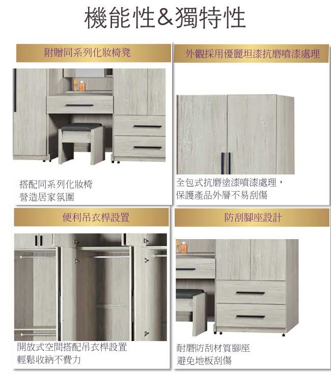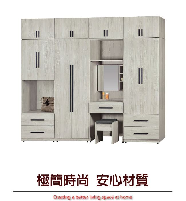 商 品 介 紹 | 【綠家居】夏艾亞淺橡10.1尺多功能鏡台式加高衣櫃組合(含化妝椅) 淺橡木紋色系+現代簡約風格+安心材質製造,整體採用防蛀木心板+防刮耐磨腳座+五金滑軌結構+強化玻璃鏡面等安心材質製造,產品外層採用防潮耐磨噴漆處理搭配採用開合式鏡面櫃+四抽屜+吊衣桿+開門櫃+開放&隱藏式收納等收納空間設計,全由專人配送到家,專業安心服務,替你省下更多時間! 【商品特色】 淺橡木紋色系+現代簡約風格+安心材質製造,使用放心+搭配居家更便利 採用防蛀木心板+防刮耐磨腳座+五金滑軌結構+強化玻璃鏡面等安心材質製造 產品外層採用防潮耐磨噴漆處理 搭配採用開合式鏡面櫃+四抽屜+開門櫃+吊衣桿+開放&隱藏式收納等收納空間設計 此商品不需要DIY組立,此商品為組立後之成品 品質保證、專業設計、貼心服務 全由專人配送到家,專業安心服務,替您省下更多時間 |