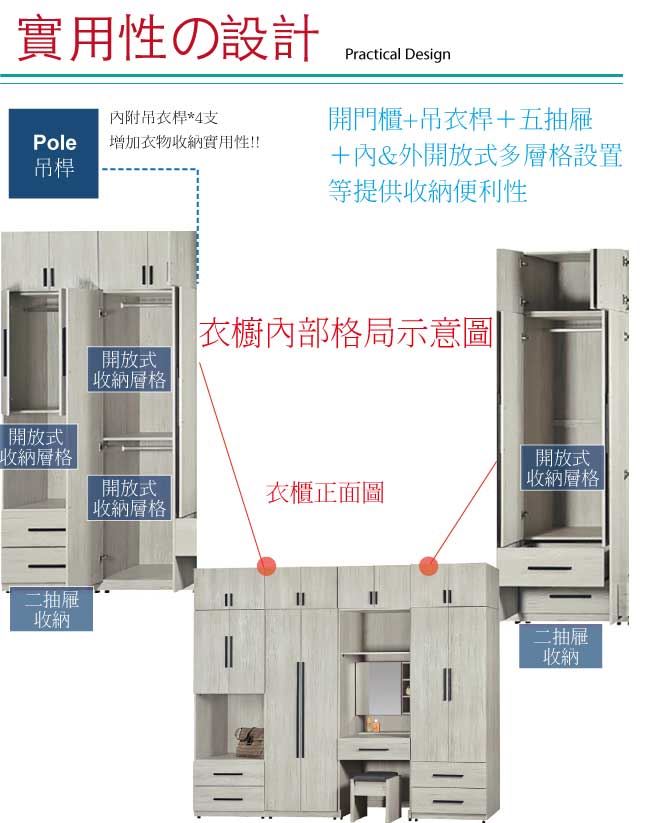 - 開合式鏡面櫃+四抽屜+吊衣桿
