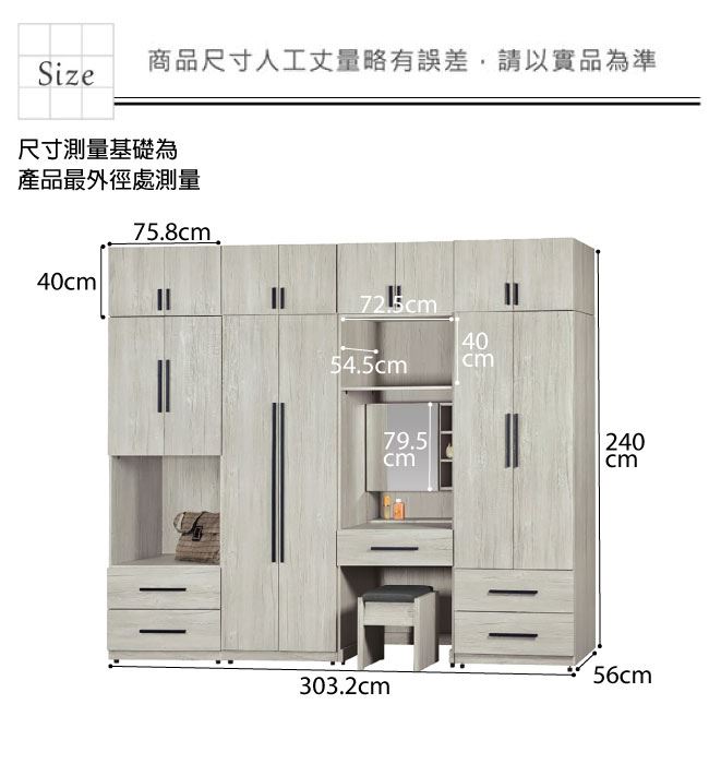 材質 | ◆產品名稱:【綠家居】夏艾亞淺橡10.1尺多功能鏡台式加高衣櫃組合(含化妝椅) 尺寸:(寬)303.2x(深)56(高)240/公分 ◆材質: 材質:防蛀木心板+防刮耐磨腳座+五金滑軌結構+強化玻璃鏡面 噴漆:防潮耐磨噴漆處理