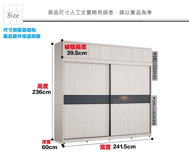 材質 | ◆產品名稱:【綠家居】摩克8.1尺四吊桿內多格推&開門加高衣櫃/收納櫃組合 尺寸:(寬)241.5(深)60(高)236公分 ◆材質: 材質:防蛀木心板+防潮耐磨腳座+5mm強化灰漆強化灰漆玻璃門片飾板+防夾手緩衝門片五金 噴漆:防潮耐磨噴漆處理
