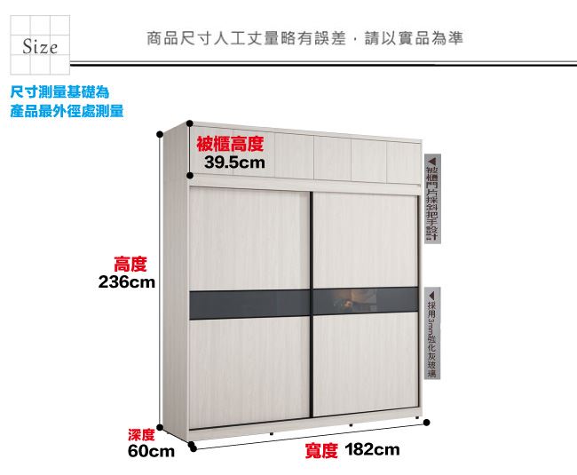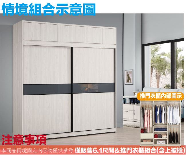 商 品 介 紹 | 【綠家居】摩克6.1尺二抽四吊衣桿拉盤推&開門加高衣櫃/收納櫃組合 淺橡木紋色系+現代簡約風格+安心材質製造,整體採用防蛀木心板+防潮耐磨腳座+五金滑軌結構+5mm強化灰漆強化灰漆玻璃門片飾板+防夾手緩衝門片五金等安心材質製造,產品外層採用防潮耐磨噴漆處理搭配採用下層推門衣櫃+上層開門被櫥櫃+吊衣桿+二抽屜+拉合式層架+內開放層格等收納空間設計,全由專人配送到家,專業安心服務,替你省下更多時間! 淺橡木紋色系+現代簡約風格+安心材質製造,使用放心+搭配居家更便利 採用防蛀木心板+防潮耐磨腳座+五金滑軌結構+5mm強化灰漆強化灰漆玻璃門片飾板+防夾手緩衝門片五金等安心材質製造 產品外層採用防潮耐磨噴漆處理 採用下層推門衣櫃+上層開門被櫥櫃+吊衣桿+二抽屜+拉合式層架+內開放層格等收納空間設計 此商品不需要DIY組立,此商品為組立後之成品 品質保證、專業設計、貼心服務 全由專人配送到家,專業安心服務,替您省下更多時間 |