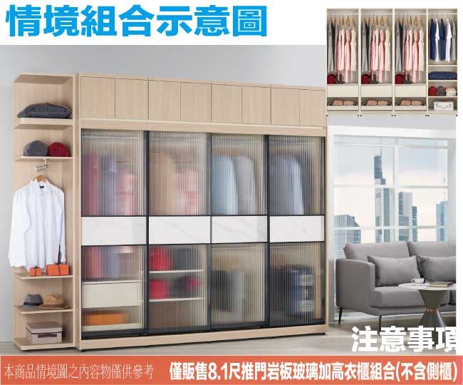 【綠家居】維爾岩板8.1尺鋁框玻璃加高衣櫃組合(吊衣桿x4+三抽屜)