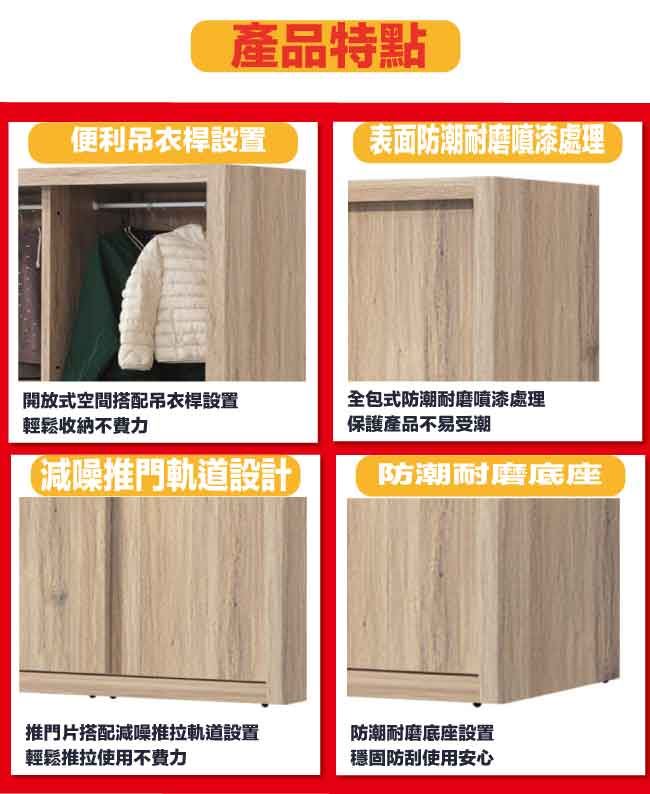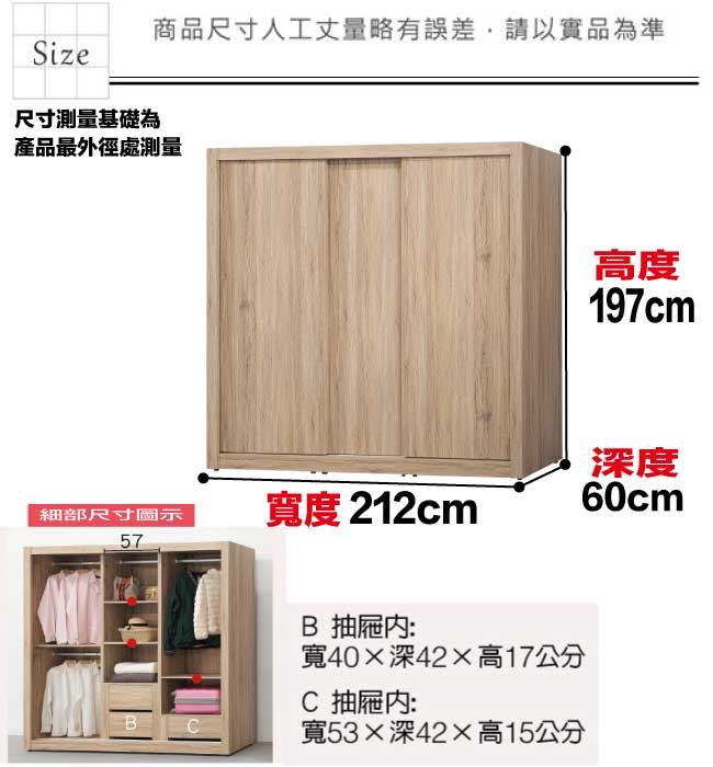 材質 | ◆產品名稱:【綠家居】克蘿7.1尺推門內三抽衣櫃 尺寸:(寬)212x(深)60x(高)197/公分 ◆材質: 材質:防蛀木心板+防潮耐磨底座+五金滑軌結構 噴漆:防潮耐磨噴漆處理 |