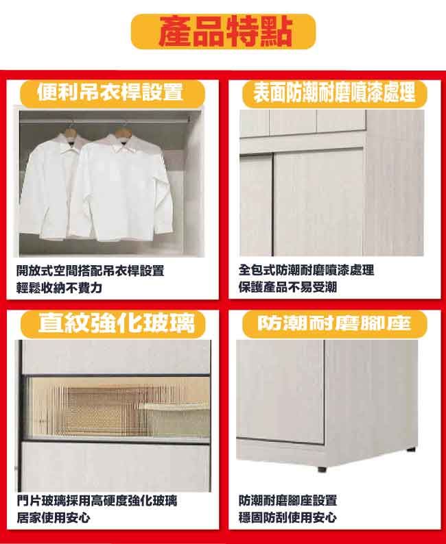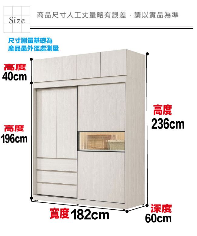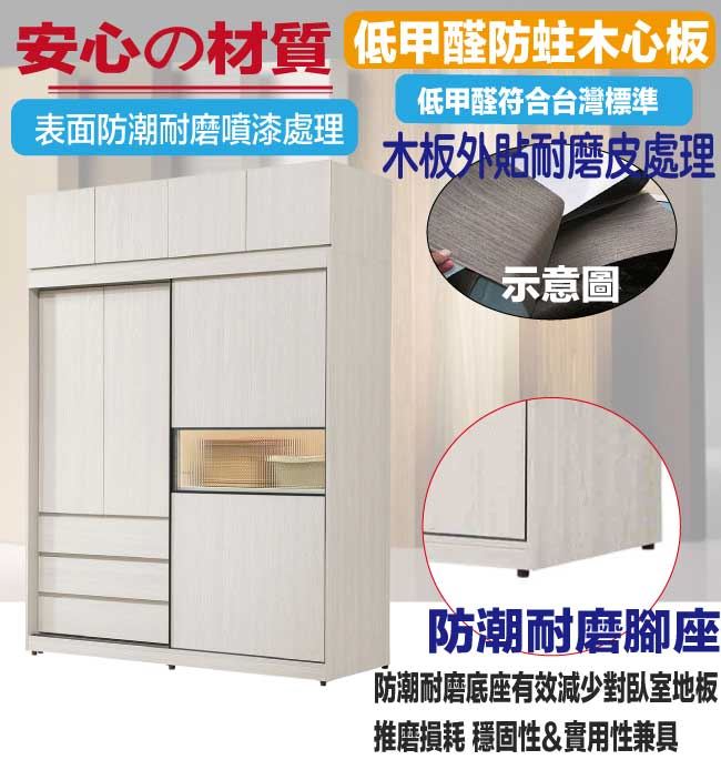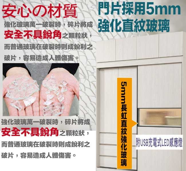材質 | ◆產品名稱:【綠家居】菲可達6.1尺玻璃開&推門加高衣櫃組合(內含LED感應燈) 尺寸:(寬)182x(深)60x(高)236/公分 ◆材質: 材質:防蛀木心板+防潮耐磨腳座+5mm強化直紋玻璃+五金滑軌結構+防夾手緩衝門片五金 噴漆:防潮耐磨噴漆處理 |